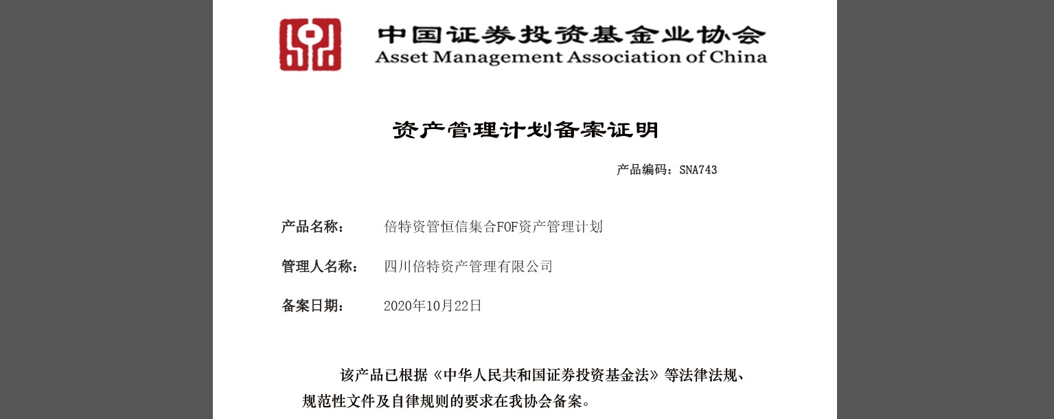 2020年10月21日,倍特期貨有限公司(以下簡(jiǎn)稱(chēng)“倍特期貨”)資產(chǎn)管理子公司——四川倍特資產(chǎn)管理有限公司(以下簡(jiǎn)稱(chēng)“倍特資管”)發(fā)起設立的資產(chǎn)配置策略私募FOF產(chǎn)品“倍特資管恒信集合FOF資產(chǎn)管理計劃”成立,并于10月22日通過(guò)中國證券投資基金業(yè)協(xié)會(huì )備案。瀏覽 : 8775分享